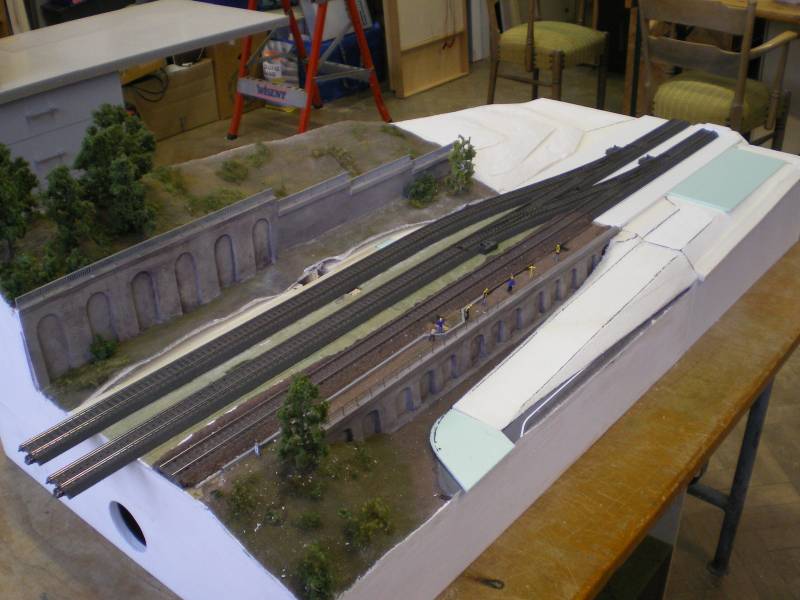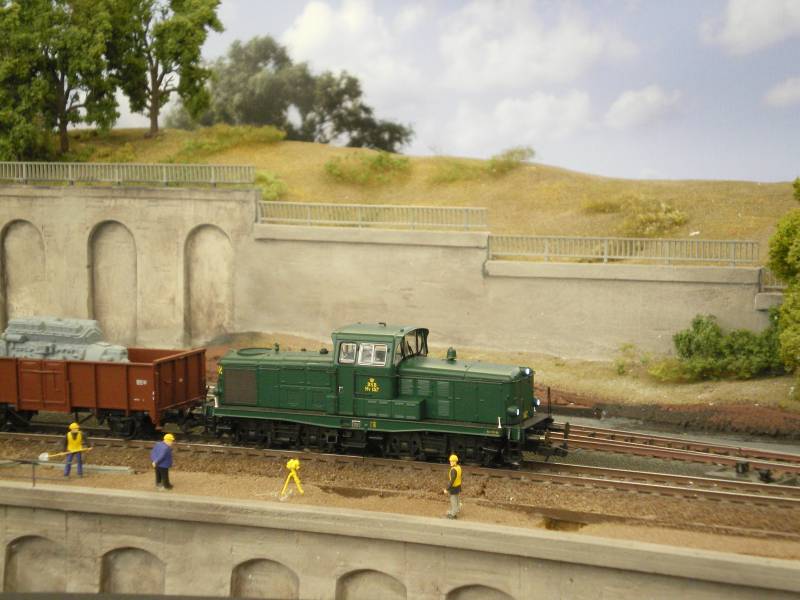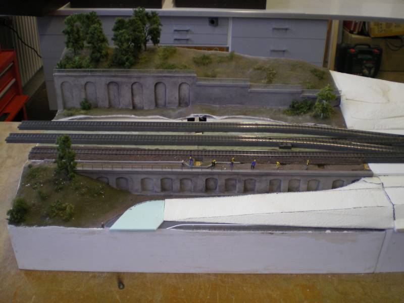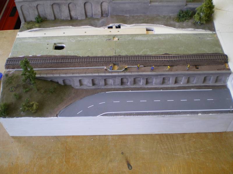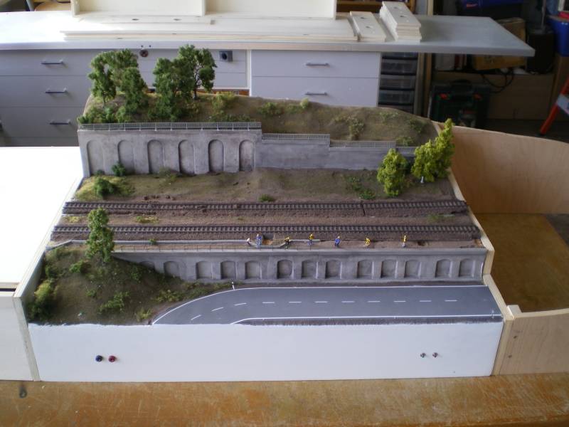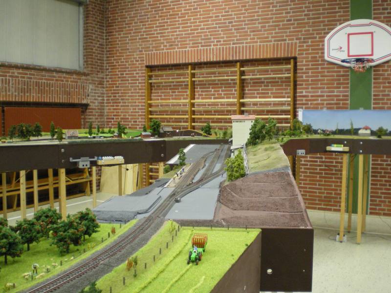im Vordergrund wurde die vorhanden Straße bereits überbaut und als Zufahrt für das Bahnwärterhaus ausgelegt. Die übrigen Landschaftskonturen wurden entsprechend angepasst.