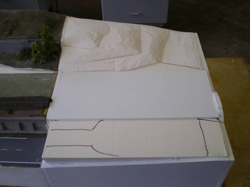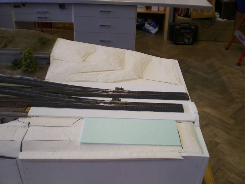 Das Ansatzstück wurde mit einem Trassenbrett für die Gleise ausgestattet, das Ur-Gelände wurde mit Hartschaumplatten aufgebaut. Im Vordergrund soll noch ein Bahnwärterhaus mit Zufahrt seinen Platz finden.