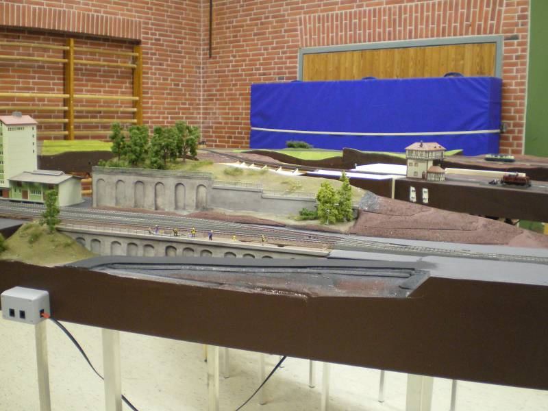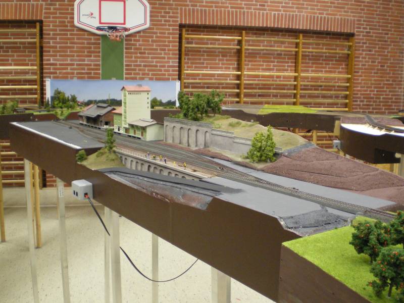 Die Ausweichanschlussstelle hat beim letzten Modultreffen für deutlich mehr Güterverkehr auf der Anlage gesorgt und hat allen Teilnehmern viel Freude bereitet In der Zwischenzeit wurde an den Modulen weiter gearbeitet, u.a. wurde ein weiteres kurzes Stück dazu gebaut, so das die Gesamtlänge nunmehr 300 cm beträgt. Auf dem neuen Modul wurde ein Silo errichtet, außerdem wurden eine Brücke zur Querung der Bahn errichtet. Auf dem folgenden Foto kann man die Neuheiten erkennen.