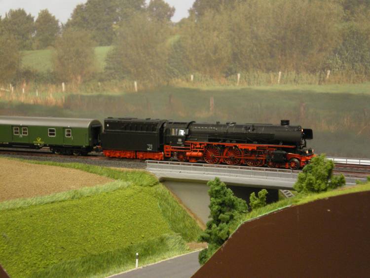 Hier sehen wir einen Schnellzug mit einer BR 01.10 auf der zweigleisigen Strecke......