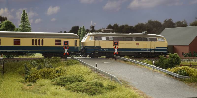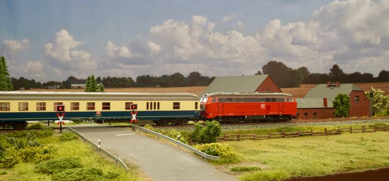 ....BR 218 mit Schnellzug am BÜ Hainstedter Moor....