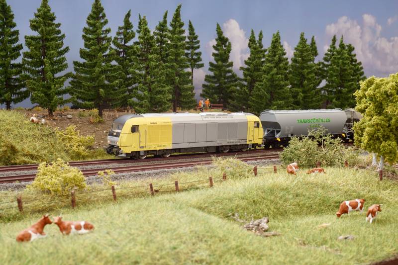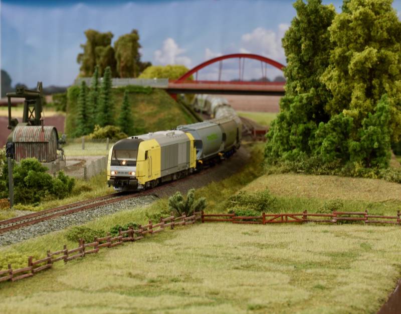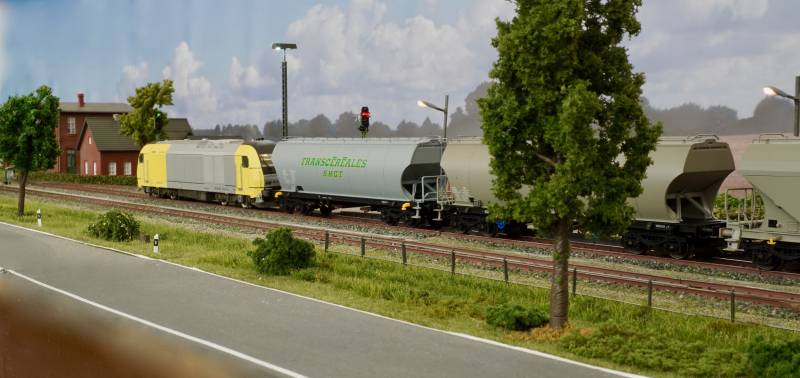 .......und nunmehr auf der Nebenstrecke Es folgt ein moderner Zug mit Getreidewagen und Diesellok vom Typ ER 20....