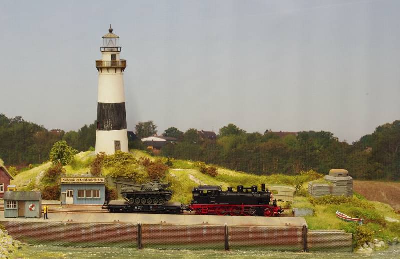 BR 75 mit Schwerlastwagen und Panzer am Leuchtturm in Klöbensiel