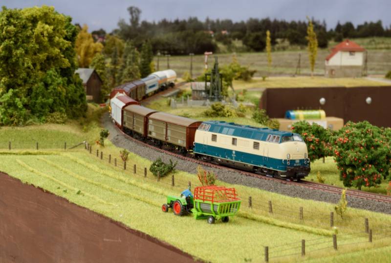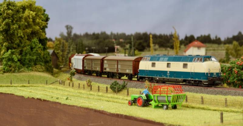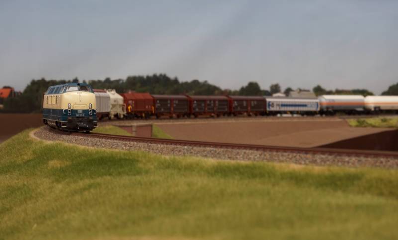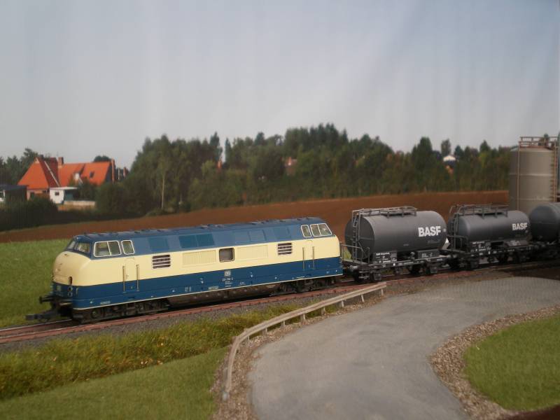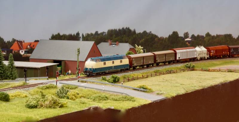 Es folgen weitere Fotos von Christian, zunächst ebenfalls mit der BR 221 in blau / beige der Epoche 4 mit einem Güterzug auf der Strecke