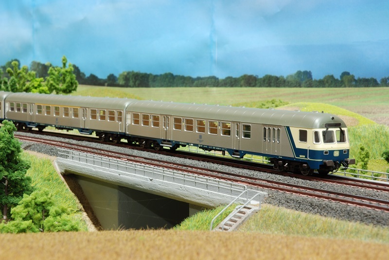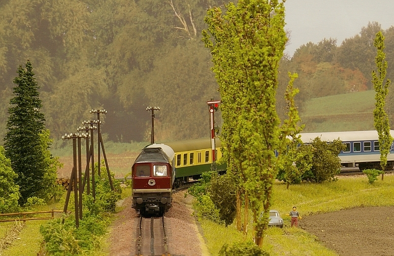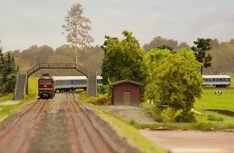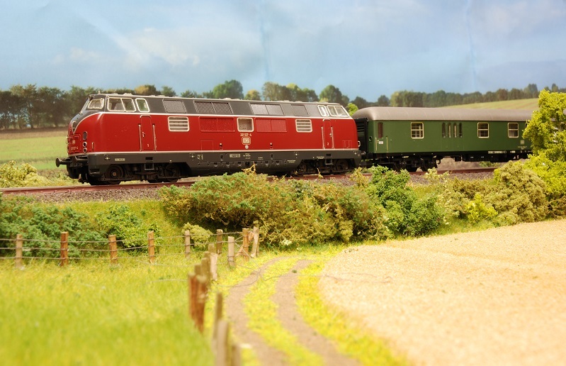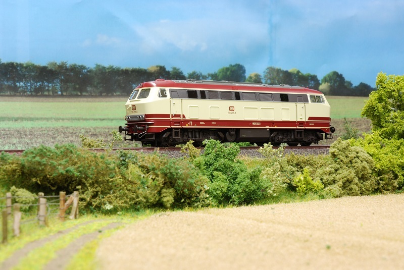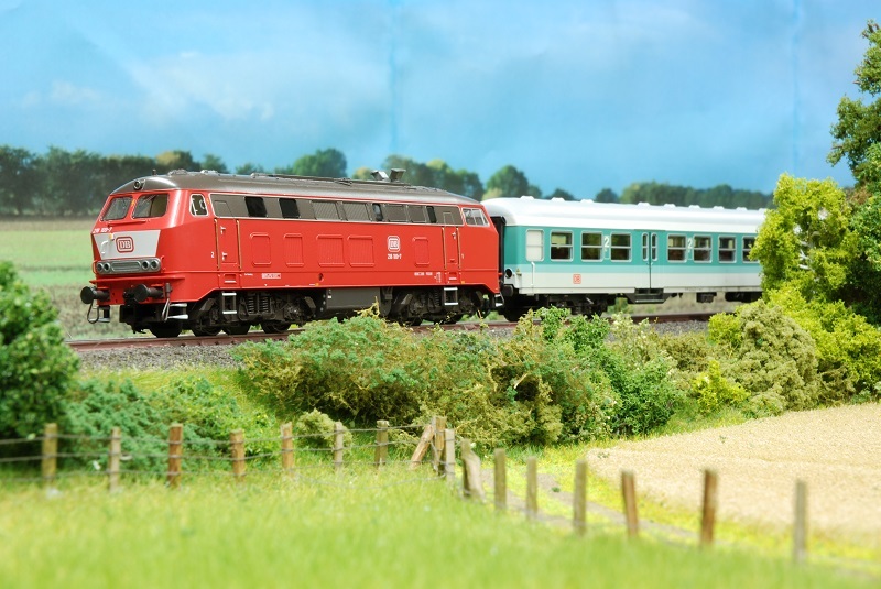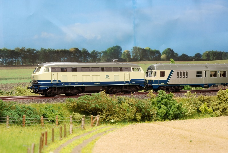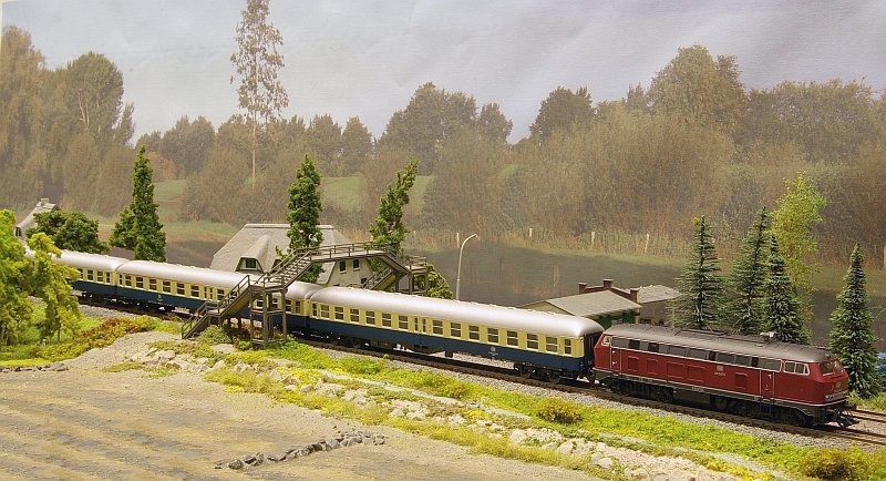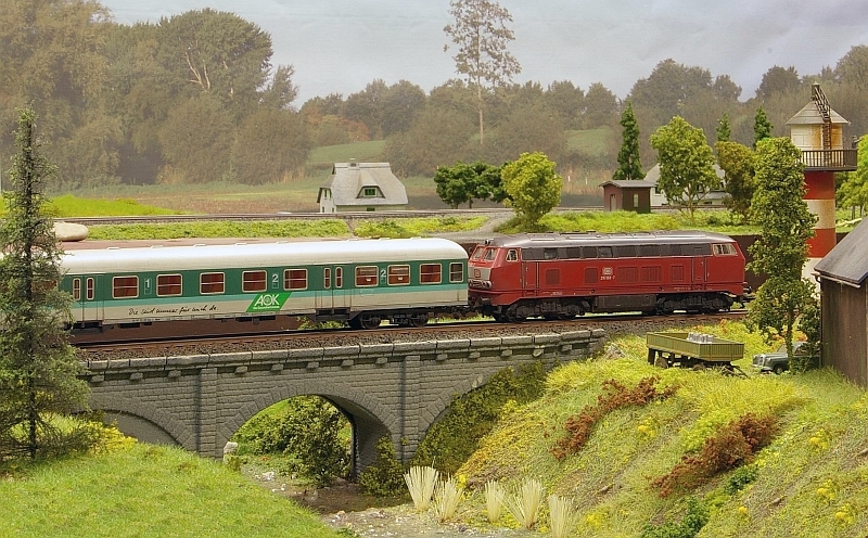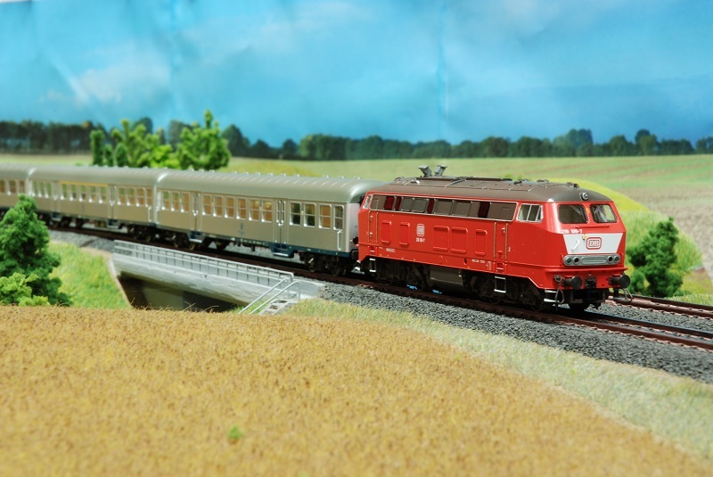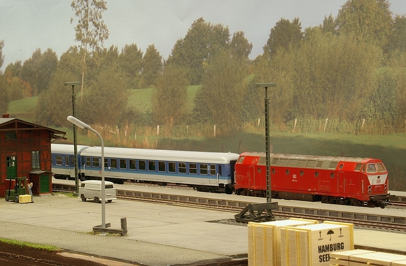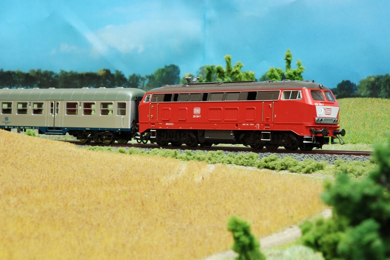 BR 218 mit Mitteleinstiegswagen auf dem Modul "Schruvendreier"