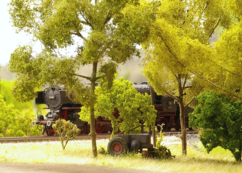 eine 01 auf der Strecke und davor ein verlassener Lanz Bulldog im Wald
