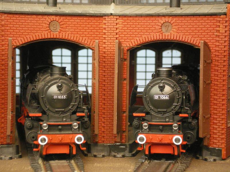 Zwei Schnellzugloks der BR 01 im BW des Bahnhofes Schönberg