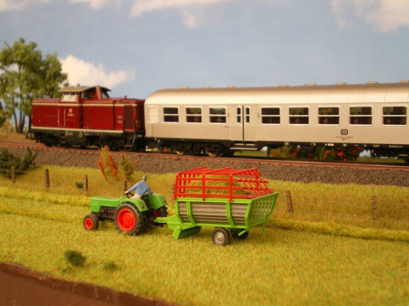 Heuernte auf dem Lande - im Hintergrund eine BR 211 mit Silberling