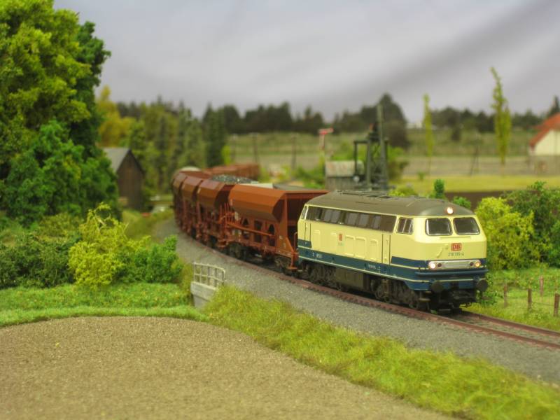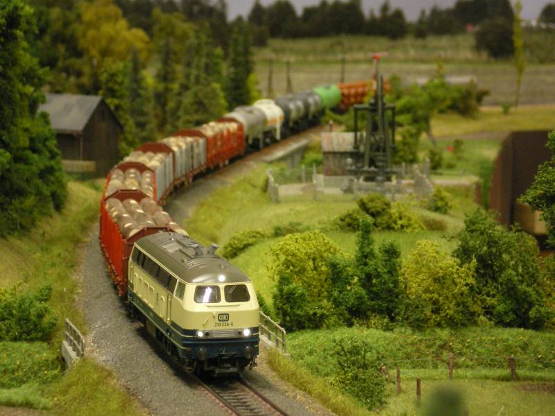 BR 218 mit Güterzug auf der zweigleisigen Strecke