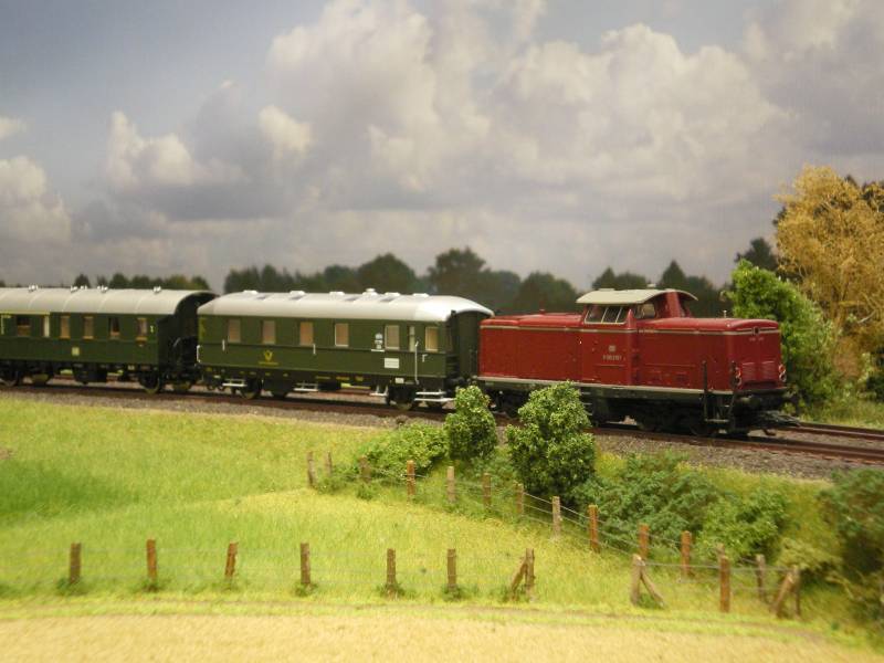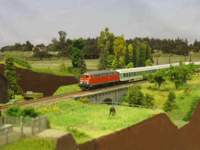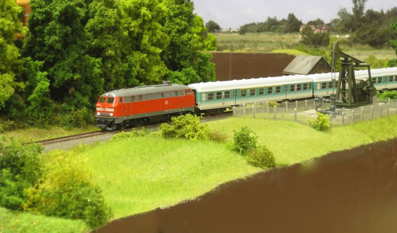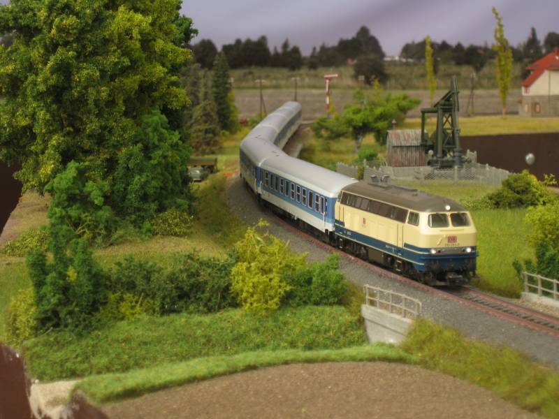 BR 218 mit Interregio auf der eingleisigen Strecke