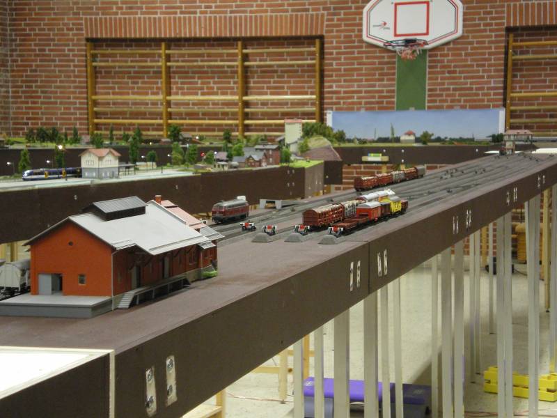 "Neuwulfenbek" Der Bahnhof Neuwulfenbek ist eine Betriebstelle die sowohl an eingleisiger als auch an zweigleisiger Strecke aufgebaut werden kann. Der Bahnhof verteilt sich derzeit (Stand Januar 2015) auf insgesamt 8 Module / Segmente (SMDV Tische). Mit einer Länge von 800 cm bietet er für die Modulbahner durchaus interessante Betriebsmöglichkeiten. Der Bahnhofsbereich verfügt über 2 Gleise, das Vorfeld über maximal 5 Gleise, davon 2 Streckengleise. Darüber hinaus verfügt der Bahnhof über einen Abzweig zu einer eingleisigen Strecke. Der Bahnhof soll mit Form- oder Lichtsignalen ausgestattet werden. Die geplante Verlängerung um 200 cm - von 600 cm auf 800 cm - wurde im Dezember 2013 umgesetzt und bei den vergangenen Modultreffen erfolgreich getestet. Ursprünglich waren die Segmente als 3-teilige Wendeschleife konzipiert und auch im Einsatz. Dann wurde die Betriebsstelle mit einem weiteren Segment - einem teilweise durchgestalteten Abzweig mit Ladestelle - ergänzt. Diese 4 Segmente wurden dann zunächst als Schattenbahnhof mit lose aufgelegten C-Gleisen genutzt. Eine Durchgestaltung war ursprünglich auch nicht geplant. Im Laufe der Zeit entstanden dann noch 2 weitere Segmente die als Bahnhof bzw. Güterschuppen dann doch weites gehend durchgestaltet wurden. Dann entstand auch noch ein "Adapter" der die Strecke von zweigleisig auf eingleisig reduziert. Die weitere Entwicklung dieser Betriebsstelle ist offen, schauen wir mal....... Der Bahnhof wurde von Peter gebaut und befindet sich wie geschildert noch in der Entwicklung.