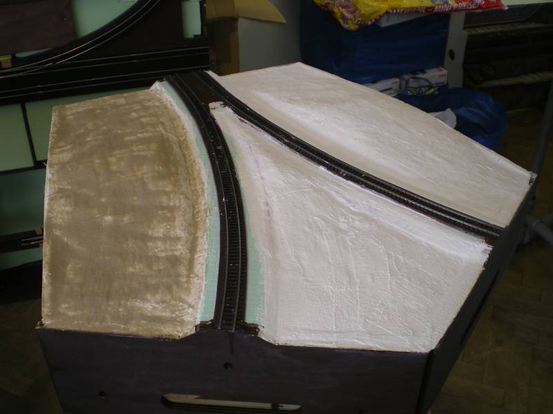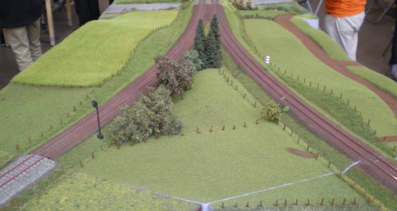Das Modul wurde zunächst grundiert und dann von außen vorgestrichen In einem nächsten Schritt wurde die Gleise verlegt und verkabelt und in einem weiteren Schritt wurde das "Urgelände" mit Hartschaumplatten aufgebaut. Der Abzweig wurde dann auch schon mal bei einem Modultreffen erfolgreich eingesetzt.