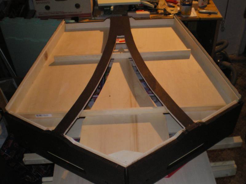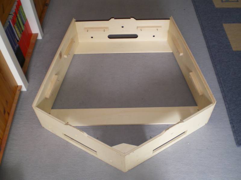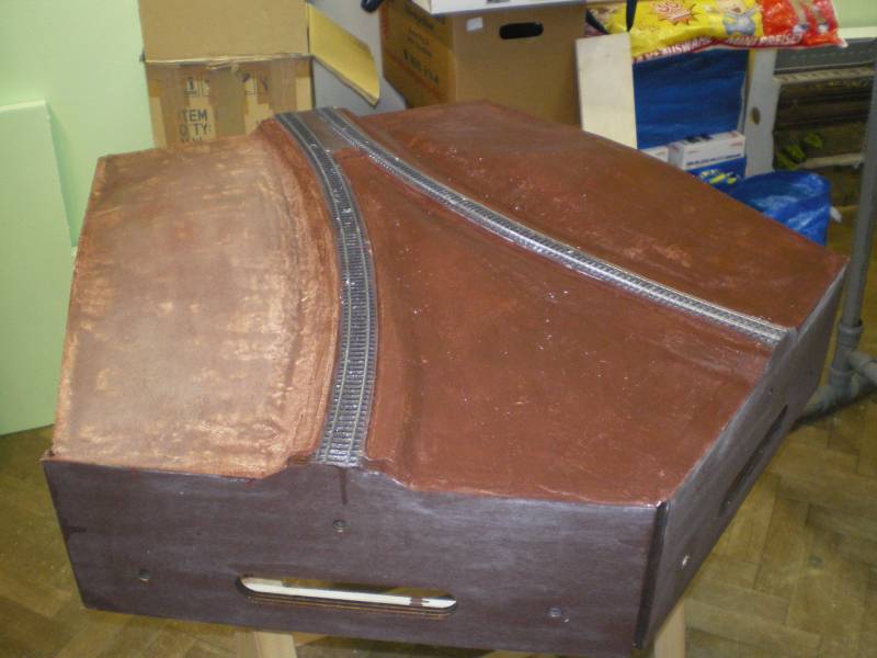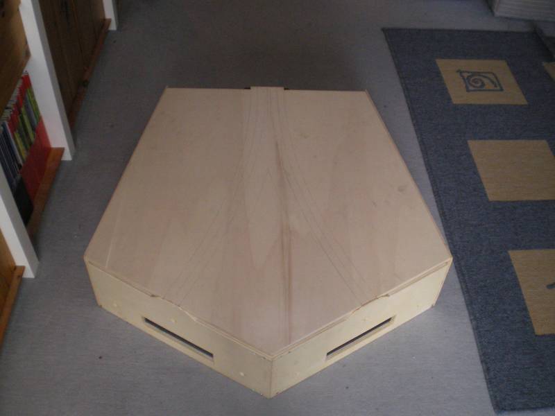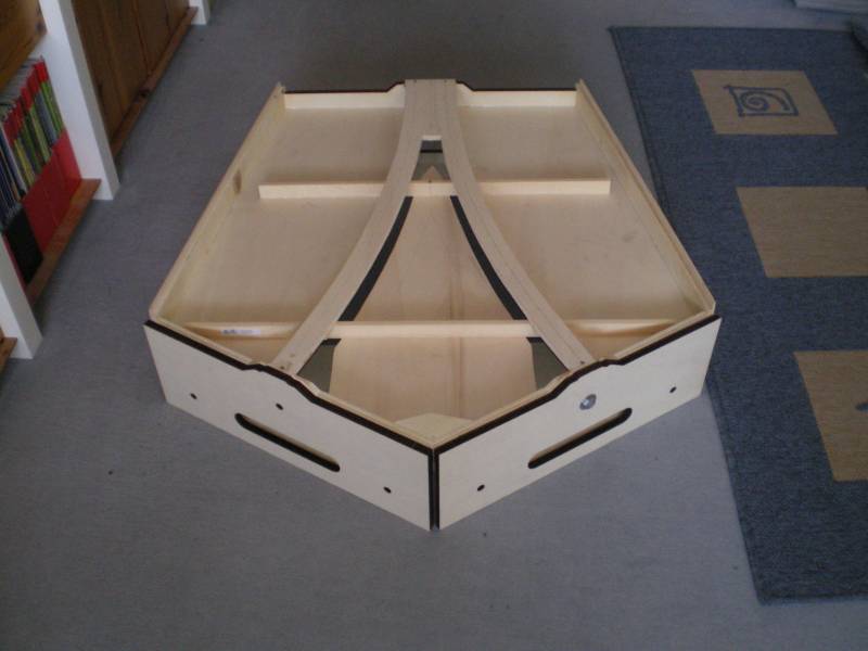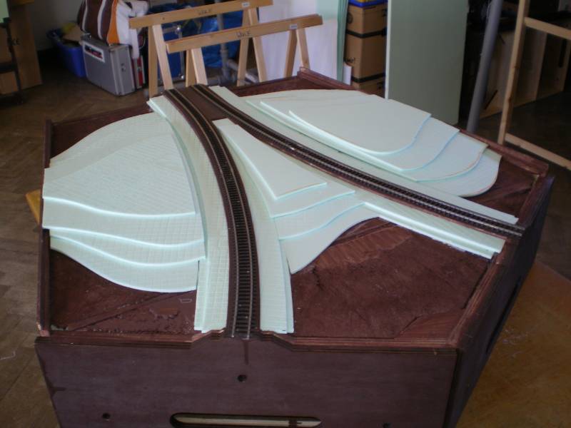 Das Trassenbrett wurde ausgeschnitten und der restliche Deckel wurde " tiefer gelegt" - der "Deckel" wurde als Basis für den Geländeaufbau mit Hartschaumplatten verwendet. Die Querleisten dienen der Aussteifung der Konstruktion, insbesondere der Trasse.