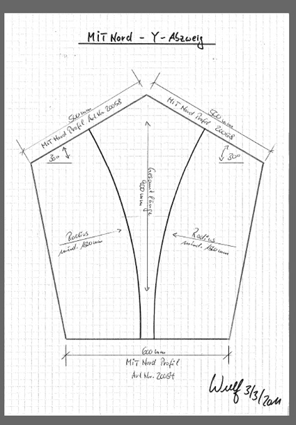 Hallo und herzlich willkommen auf dieser Seite. An dieser Stelle möchte ich ein weiteres Modul des MIT Nord vorstellen. Es handelt sich um einen Y-Abzweig, der vielseitig verwendbar ist. Die Strecke verzweigt von einer zweigleisigen Strecke auf zwei eingleisige Strecken. Zunächst wurde eine Zeichnung gemacht, die als Grundlage für die Bestellung bzw. das zuschneiden beim Tischler verwendet wurde.